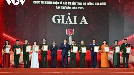 (VOVWORLD) -President Luong Cuong and other senior leaders presented 12 A prizes, 23 B prizes, and 36 C prizes to individuals at the award ceremony for the 2025 Contest on Defending the Party’s Ideological Foundation in Hanoi on Wednesday. The Voice of Vietnam won one A prize and one C prize.