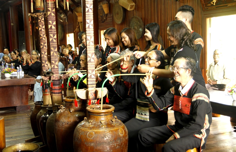 When the host orders the ceremony to begin, the gong performers play a melody called “Family reunion”. Ede girls dance in honor of the senior villagers. Then their children wish them longevity and good health and give them gifts. All participants drink wine from the 12 vases, dance, and sing folk songs.