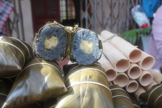 The Giay’s glutinous rice cakes have lozenge shape with two tapered ends. They also call it hump cake. The villagers say that they carefully choose materials to make good cakes. They pick the leaf wrap in the forest, sort out the best quality glutinous rice grown in their fields, and husk green beans. Mixed lean and fat pork is sliced and seasoned with many kinds of spices, including cardamom. Dexterous women carefully wrap the cake in leaves. The cake should have a nice lozenge shape and each slice should have three layers – rice, green beans, and pork.