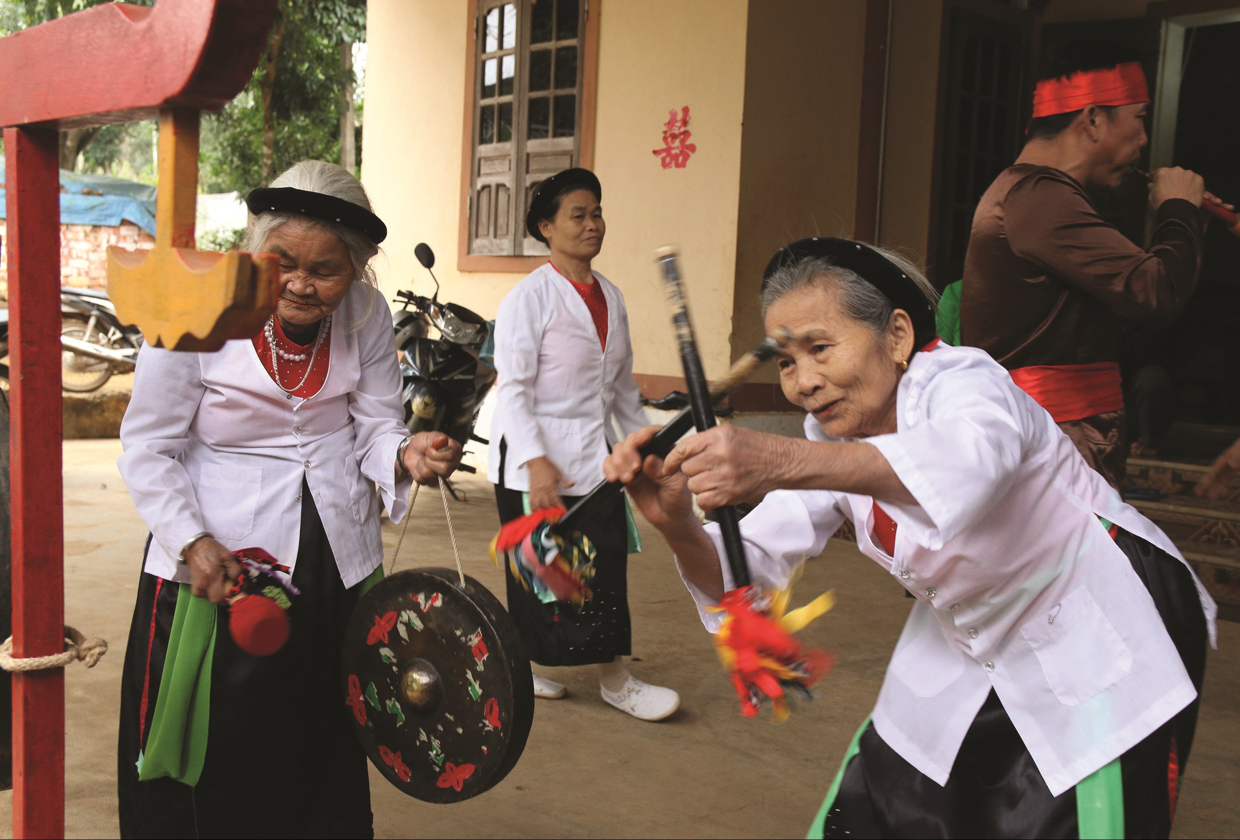 A set of gongs includes 4 gongs hung on a frame arranged from smallest to biggest. Le Thi Dung, a gong player who lives in Thang Son village, Thanh Hoa province, said: “At a festival, the women play the gongs and the men play drums. At any happy or sad event, we always play gongs. We want to preserve this culture for our children.”