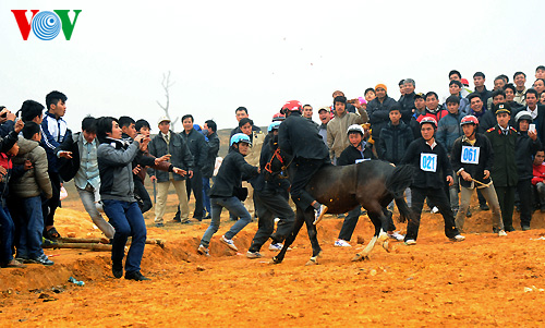 Mong jockeys wear their traditional clothing, plus plastic helmets and canvas shoes. They ride with a bridle but no saddle. 16 horses race in pairs. Sometimes, a nervous horse gallops off the race track as the jockey tries in vain to control it. Some jockeys fall on a sharp turn, making viewers’ hearts miss a beat. Vang Van Quyet and Vang Van Cuong of Na Ang B hamlet, Na Hoi commune, just finished their race. “I’ve been around horses since I was small. I sit firmly on the horseback and try to keep my balance. I understand when the horse is about to turn and do some things to control it.” Quyet said.