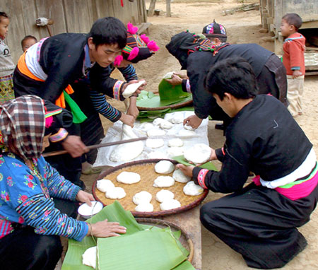 The Mong people prepare rice and pound the paste in the final days of the old year. The thud, thud, thud sound echos everywhere and the aroma of sticky rice pervades the air.