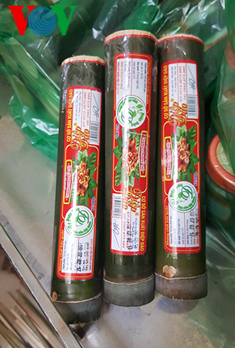 According to Sa Thi Tam of Xuan Son district, the bamboo tubes should be neither too young nor too old. Several guava leaves should be placed at the two ends of the tube to prevent mould and trigger the fermentation. The pork should be packed into the tubes tightly.