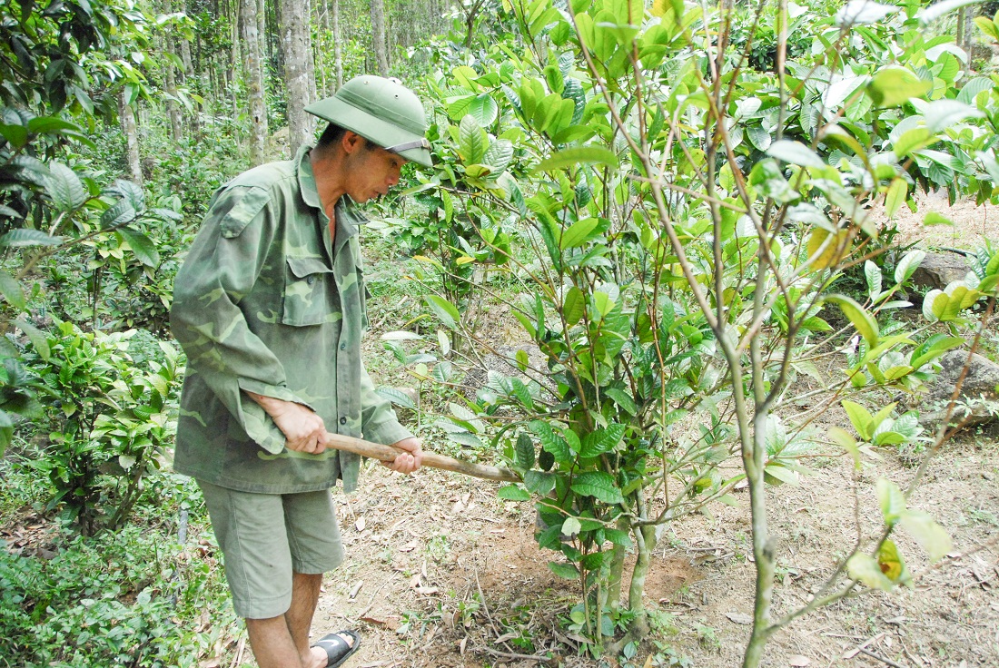 Trieu Tai Cao in Bang Anh hamlet is in charge of protecting 9ha of natural forest in Tan Dan commune. In 2017 his forest was chosen as a model for growing medicinal plants.