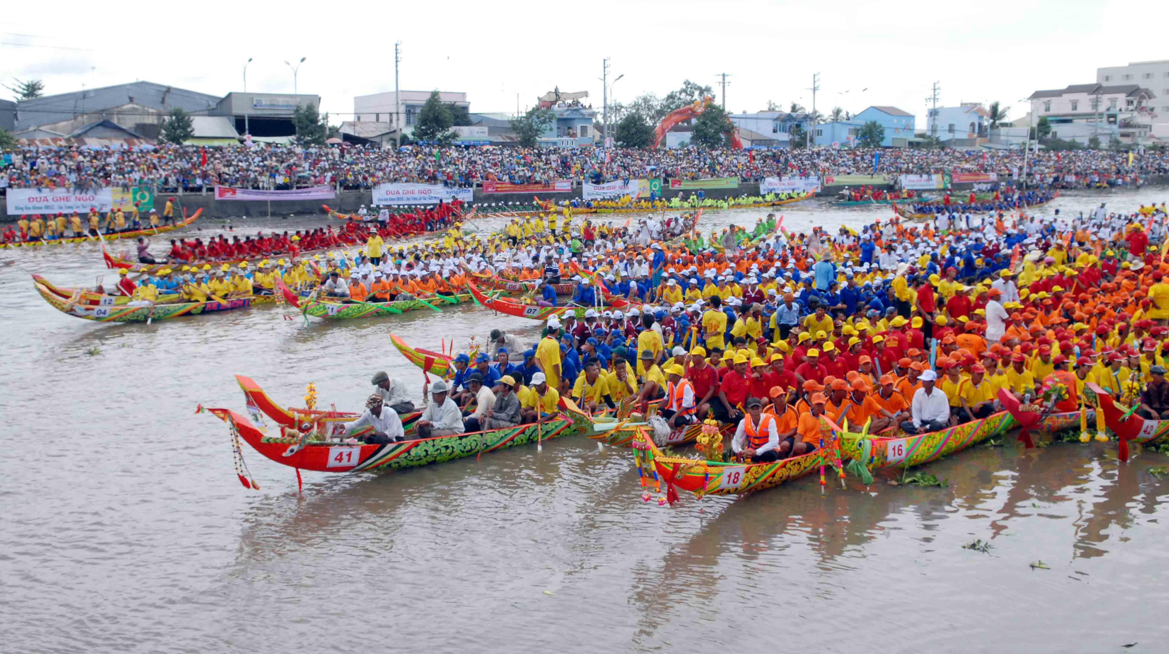 For navigating the crisscrossing rivers and canals of the Mekong delta, the Khmer use many types of junks and boats. The most interesting one is the 30-m long Ngo junk, made of wood and decorated with images of sea eagles, elephants, and tigers. It requires 30 to 40 oarsmen to row it and is used only during the Ok-ang Bok festival in the 10th lunar month.