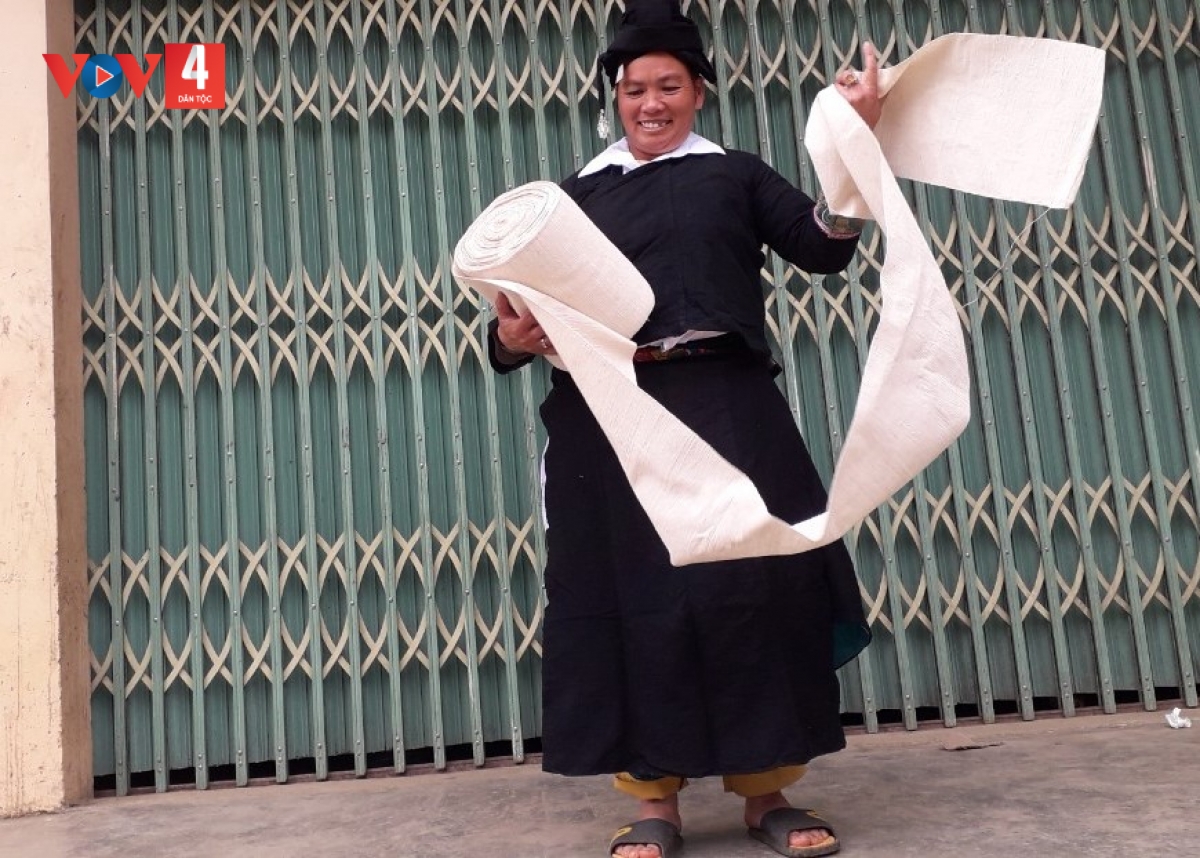 A Thu Lao woman holds a roll of white cotton fabric. (Photo: Giang Seo Pua/ VOV4) |