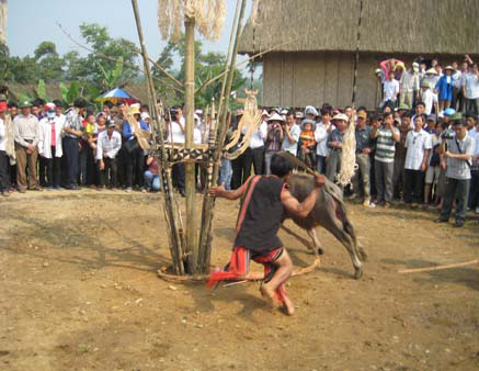 Among their other festivals, such as buffalo stabbing and house warming, the festival of sowing rice is the most important. Before festival day, families contribute offerings such as buffaloes, pigs and chicken. Villagers build a 1 meter high pole called Sooc-rooc, which is topped with a basket containing items offered to the gods. A strong buffalo is washed and fed before being tied to a 5-meter decorated pole called Gung which is placed in the middle of the festival site. Ritual sacrifices kick off the festival.
