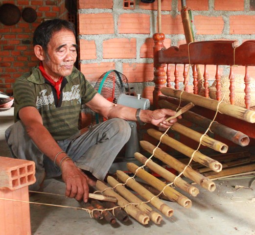 The T’rung is one of the most popular musical instruments of the Bana. Bamboo tubes of graduated sizes are tied together by rattan strings. One end of the tubes is blocked while the other end is diagonally cut to produce different tones that sound like a murmuring brook, a crashing waterfalls or a wind blowing through bamboo trees. A Ngoh, a Bana man in Dak Lak, says: "We never play the T’rung inside the house. There we play the K’long Put. The original T’rung has 7 or 8 tubes, but the modern T’rung has many more tubes to play more melodies."