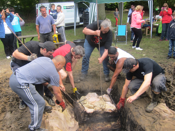 A: Yeah the hole is really big. Sometimes we put a whole cow in there, a cow, a sheep, a pig, a whole animal. It’s about 1 meter deep, but it could be 2 or 3 meters wide. Over maybe 8 or 10 hours, it’s cooked in the ground. You just leave it, you forget about it, and you go back later.