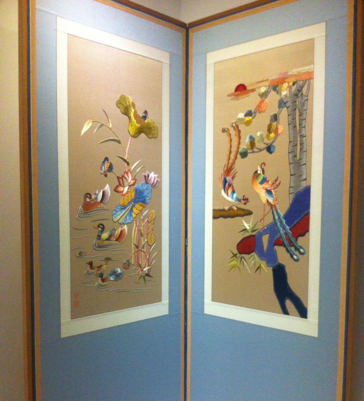 “Green Dragon white tiger” is the biggest work of art in this exhibit, and also the largest piece in Lee Jung Hee’s 30 year career. The curtain measures 50cm by180cm and took her three years of working 12-hour days to finish. Learning embroidery requires patience, time, love, and passion. Even a small flower takes 2 to 3 hours to embroider. For this reason, royal embroidery is not a common art in Korea. Lee said: “Korean royal embroidery started developing in the feudal period and was reserved only for member of the royal family or high-ranking officials. Nowadays, anyone can have the opportunity to learn this royal art. Korean artists have created many diverse embroidery techniques, which can be used in both traditional and contemporary designs. When an artist starts embroidering, she will look at the whole picture and decide which techniques to use.”