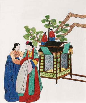 In Korea, the patterns or symbols on the clothes showed the wearer’s rank in society. A dragon embroidered with valuable thread appeared on the chest, back, and shoulders of the King and Crown Prince’s costumes to represent power. A phoenix represented the queen, while Princesses and royal concubines wore floral patterns. High ranking court officials wore patterns with clouds and cranes. These patterns symbolize longevity, luck, and wealth, according to Korean culture.