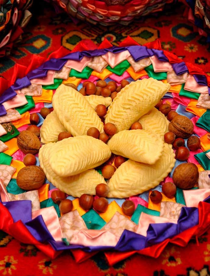 Khoncha is one of the essential parts of the holiday table. It is a tray filled with sweets, nuts, candies, and other treats. Each of the sweets baked for Novruz has a symbolic meaning. Pakhlava represents the four parts of the world, Goghal – the sun, Shekerbura – the moon, and the eggs painted for Novruz are a symbol of life. Samani decorates the middle of the tray and is tied with red ribbon.