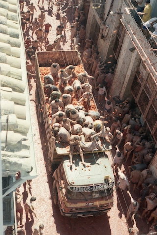 Well, there are several different stories about the beginning of the Tomatina but the more reliable seems to be that, one day, back in 1945, on the occasion of the Saint Louis festivity in Brunol, which is on the last Wednesday of August, and apparently a group of young people, young girls, they tried to get better position in the font line of the parade. So when they were pushing people to go through, one of the musician of the band, he fell out. So he got absolutely upset, then he saw a little shop there with tomatoes. He started to throw tomatoes against those young girls so the young girls answer back. Well, that’s a big deal in a small community, a very tiny town. So the next year, the same group of young people they decided to start over the same thing that happened the previous year. So they started throwing tomatoes again. With that kind of game, La Tomatina started. So that’s the how it happens.