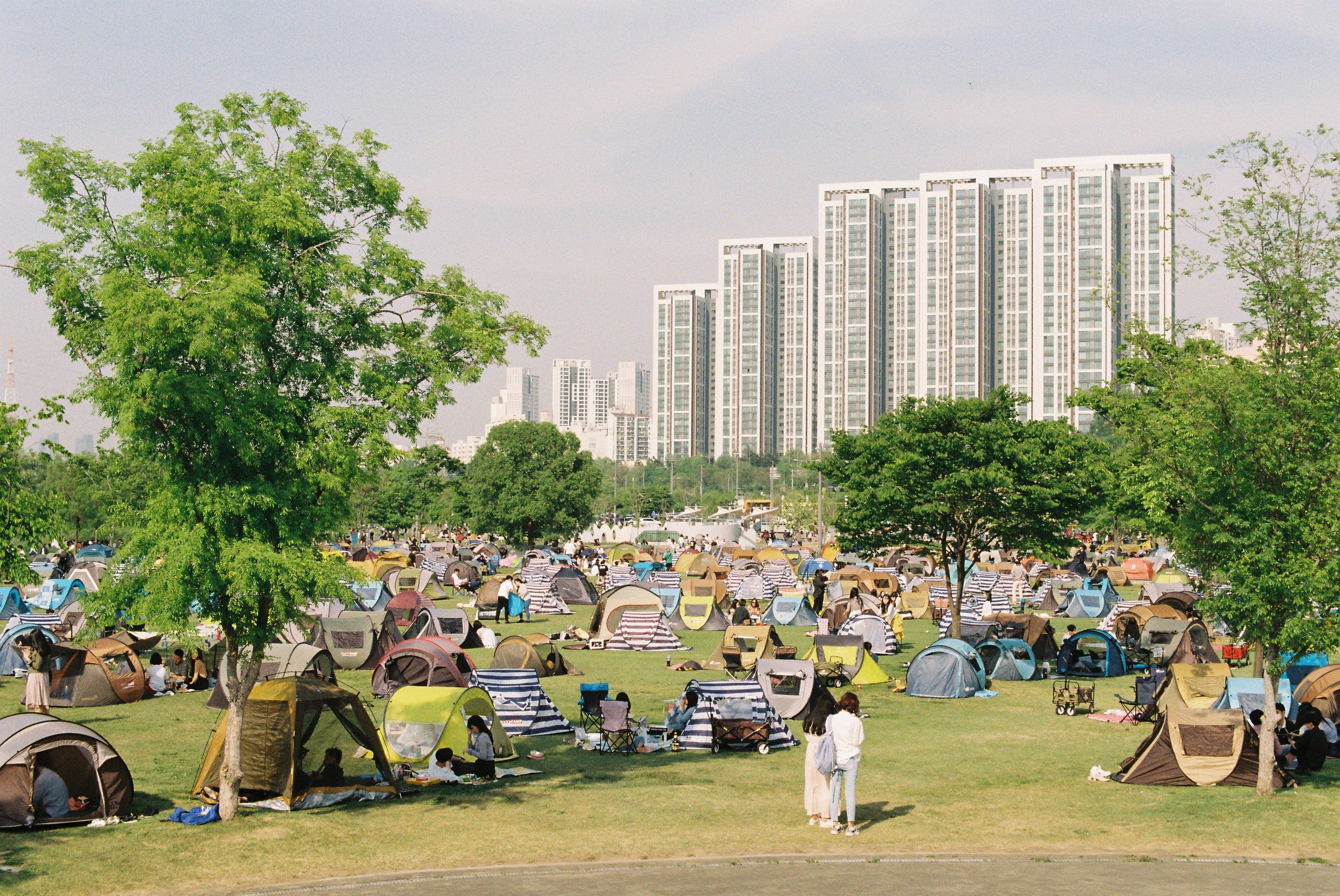 J: Actually most areas in Hangang cannot enter after 11p.m. for safety reasons. However, in certain areas, family and friends can relax and enjoy camping. There are tents and campers available if you make a reservation in advance. Han River Park also hosts a variety of events, especially swimming pools in summer and a skating rink in winter. There are also movies at night.