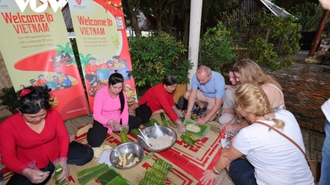 (VOVWORLD) - A few days before the Lunar New Year of the Horse, foreign visitors to Ho Chi Minh City and the Mekong Delta join in Tet activities typical of the Mekong Delta, trying their hand at wrapping banh tet (cylindrical square sticky rice cakes), making coconut jam, writing calligraphy words, arranging a 5-fruit tray, and burning incense on an ancestral altar.