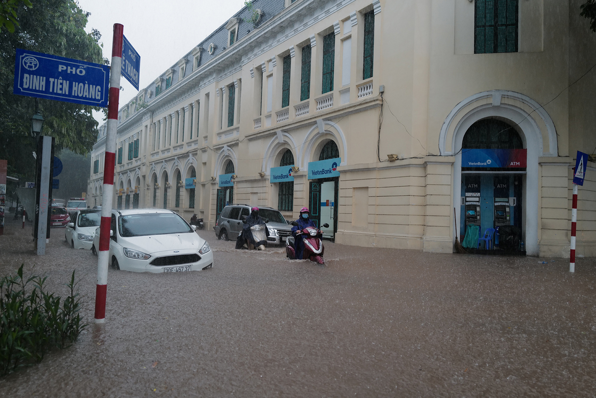 Die Kreuzung von Dinh Tien Hoang und Le Thach am Hoan-Kiem-See steht bis zu 60 Zentimeter tief unter Wasser beim Regen am Nachmittag des 17. August. (Foto: Vnexpress.net)