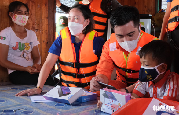 Vertreter des Jugendverbands in Hanoi überreichen Tablets an Kinder im Fischerdorf am Roten Fluss. (Foto: Tuoitre.vn) |
