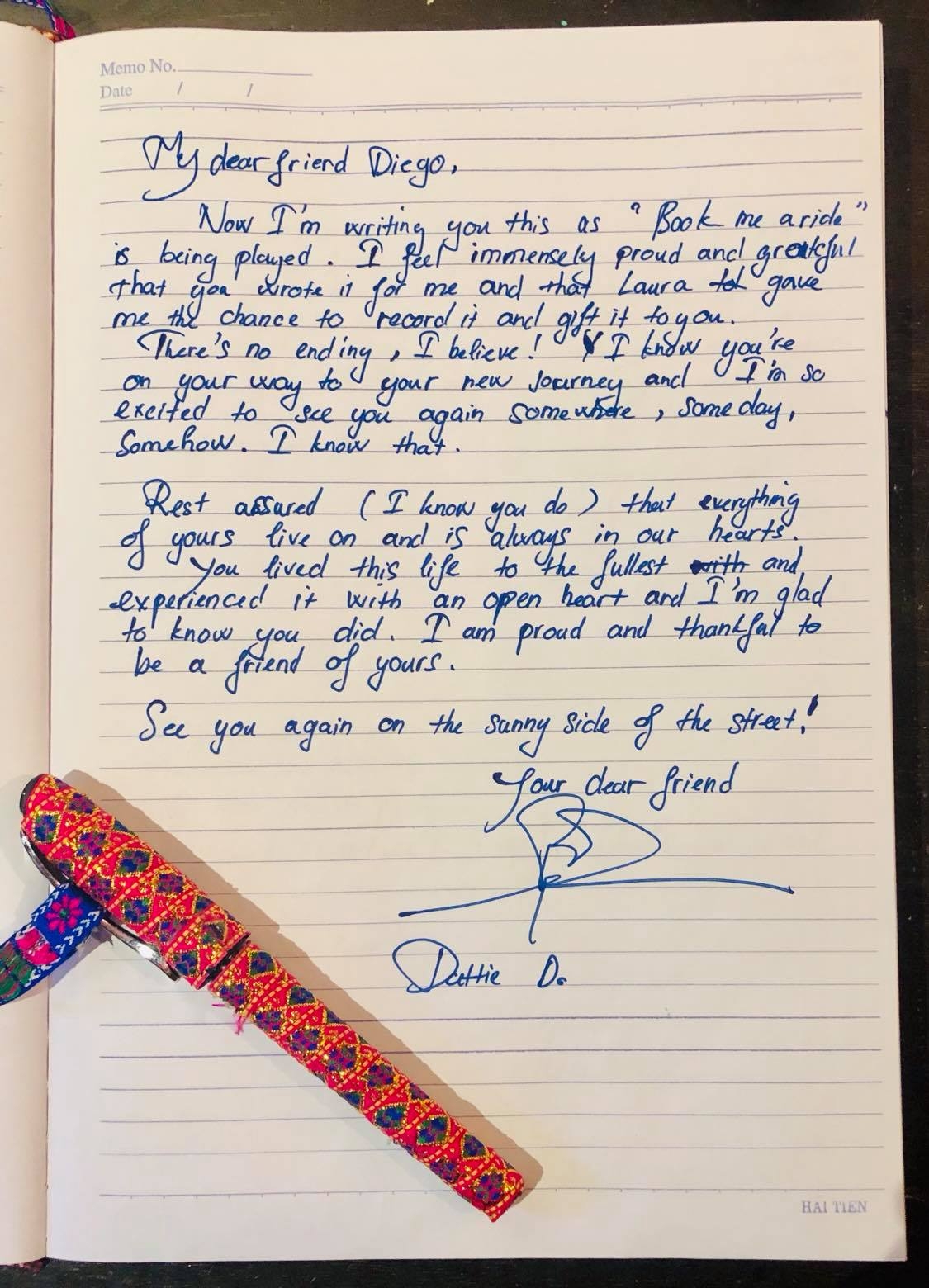 “Er ist ein Workaholic, immer kreativ und voller Ideen. Während er unterwegs war, kam er manchmal auf einige Ideen. Er blieb sofort stehen und gab Skizzen dieser Ideen. Diego liebt die Kultur sehr, besonders die vietnamesische Kultur. Er verbringt viel Zeit damit, die vietnamesische Kultur kennenzulernen. Obwohl er Ausländer ist, kennt er sich sehr gut mit der vietnamesischen Kultur aus und liebt Vietnam. Diese Liebe hat ihm positive Emotionen und Energie gebracht, damit er es in Kunst, in Werke verwandelt, die von vielen Menschen geliebt werden.”