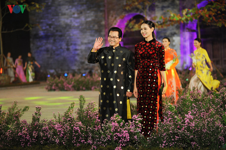 | Bei der Eröffnungsfeier des Ao Dai-Festivals Hanoi 2016 sind Zuschauer überrascht über eine beeindruckende Vorführung von besonderen Models. Die Models sind schöne und berühmte vietnamesische Schauspieler und Schauspielerinnen. Auf dem Foto sieht man die ausgezeichnete Künstlerin Lan Huong (Mitte) und den ausgezeichneten Künstler Tien Hoi, die einen Ao Dai des Designers Quang Huy tragen. |