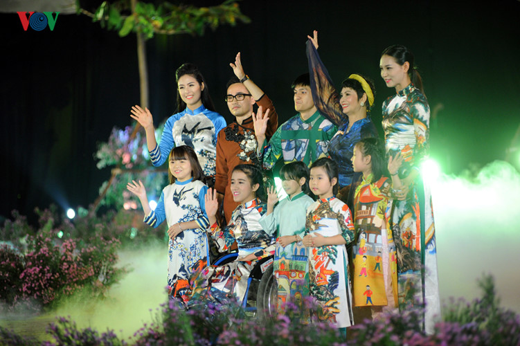 | Schauspielerin Minh Chau und behinderte Kinder nehmen an der Ao Dai-Show der Designerin Ngoc Han teil. |