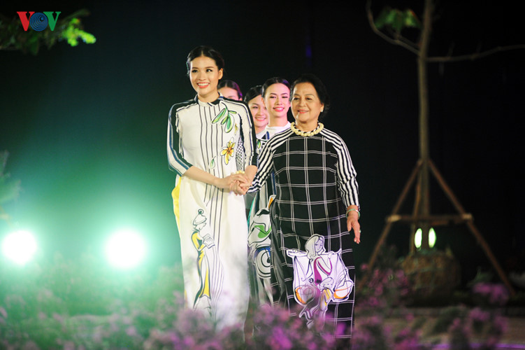 | Die ausgezeichnete Künstlerin Chieu Xuan (2.v.r) und die Vertreterin der Weltgesundheitsorganisation, Tuija Bercovici, nehmen an der Ao Dai-Show der Designerin Lan Huong teil. |