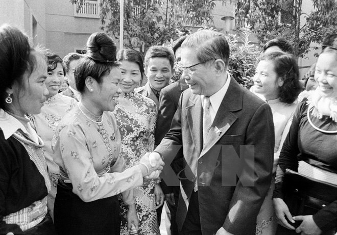 | KPV-Generalsekretär Nguyen Van Linh besucht Einwohner in der Gemeinde Giai Pham in der nordvietnamesischen Provinz Hai Hung. (Foto: Xuan Lam/ vietnamplus.vn) |