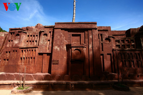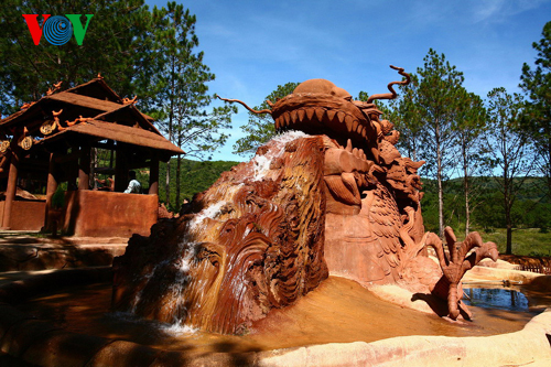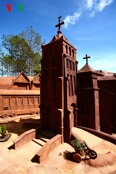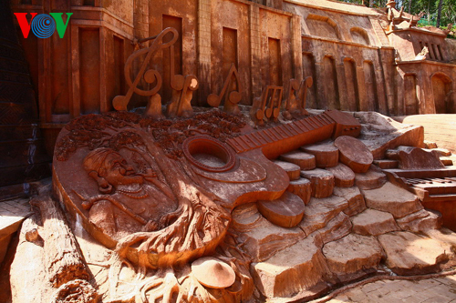 “Der Tunnel der Bildhauerei” wird aus dem roten Lehm des Hochlands und einigen anderen Baumaterialen gebaut Die Zusammensetzung ergibt einen natürlichen und starken Baustoff in der typisch roten Farbe des Bodens. Der Plan zum Bau dieser Einrichtung wurde seit 2008 ausgearbeitet. Nach vielen Versuchen ist es dem Inhaber des Tourismusgebiets Trinh Ba Dung gelungen, das beste Baumaterial für die Errichtung des großartigen Bildhauerwerks zu finden. Das Werk ist das Ergebnis der Arbeit von mehr als 100 Malern, Bildhauern und Maurern.