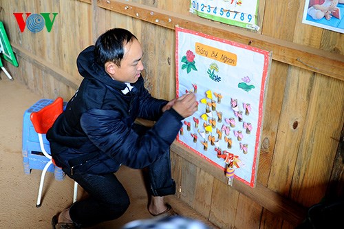 | 4. Es gibt 29 Kinder in der Gruppe von Giang, die alle zur Mong-Minderheit gehören. Die Lehr- und Lernmittel im Kindergarten Lao Chai sind sehr beschränkt. Aber Erzieher Giang und seine Kollegen überwinden täglich Schwierigkeiten, um die Kinder gut zu betreuen und ihnen viel beizubringen. |