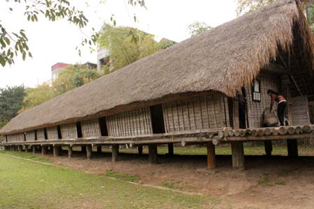 Das lange Haus der Minderheitsvolksgruppe E De ist ein Stelzenhaus und ist aus Bambus und Holz gemacht. Der Boden und die Wände wurden aus Bambus gemacht, das Dach ist von japanischen Blutgras bedeckt. Die Haupttür des Hauses von Volksgruppe E De nach Brauch gen Norden oder Süden gerichtet. Von der Ferne aus sieht das Haus aus, wie ein Boot. Vize-Direktor Nguyen Duy Thieu des ethnologischen Museums sagt dazu: