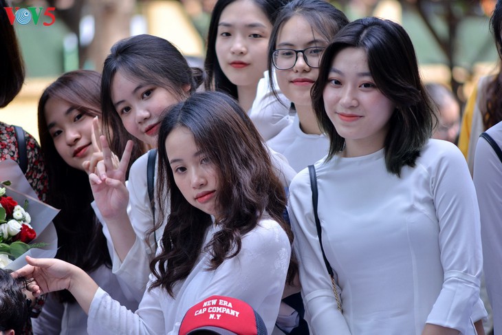 Seit frühem Morgen haben sich die Schülerinnen und Schüler in Uniform und in der weißen Tracht Ao Dai versammelt. |