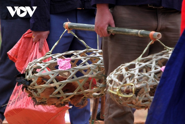 Die Opfergaben der Giay in Lai Chau bestehen aus einem Krug Reiswein, zwei Körben mit Kuchen und zwei Körben mit eingesperrten Hühnern.