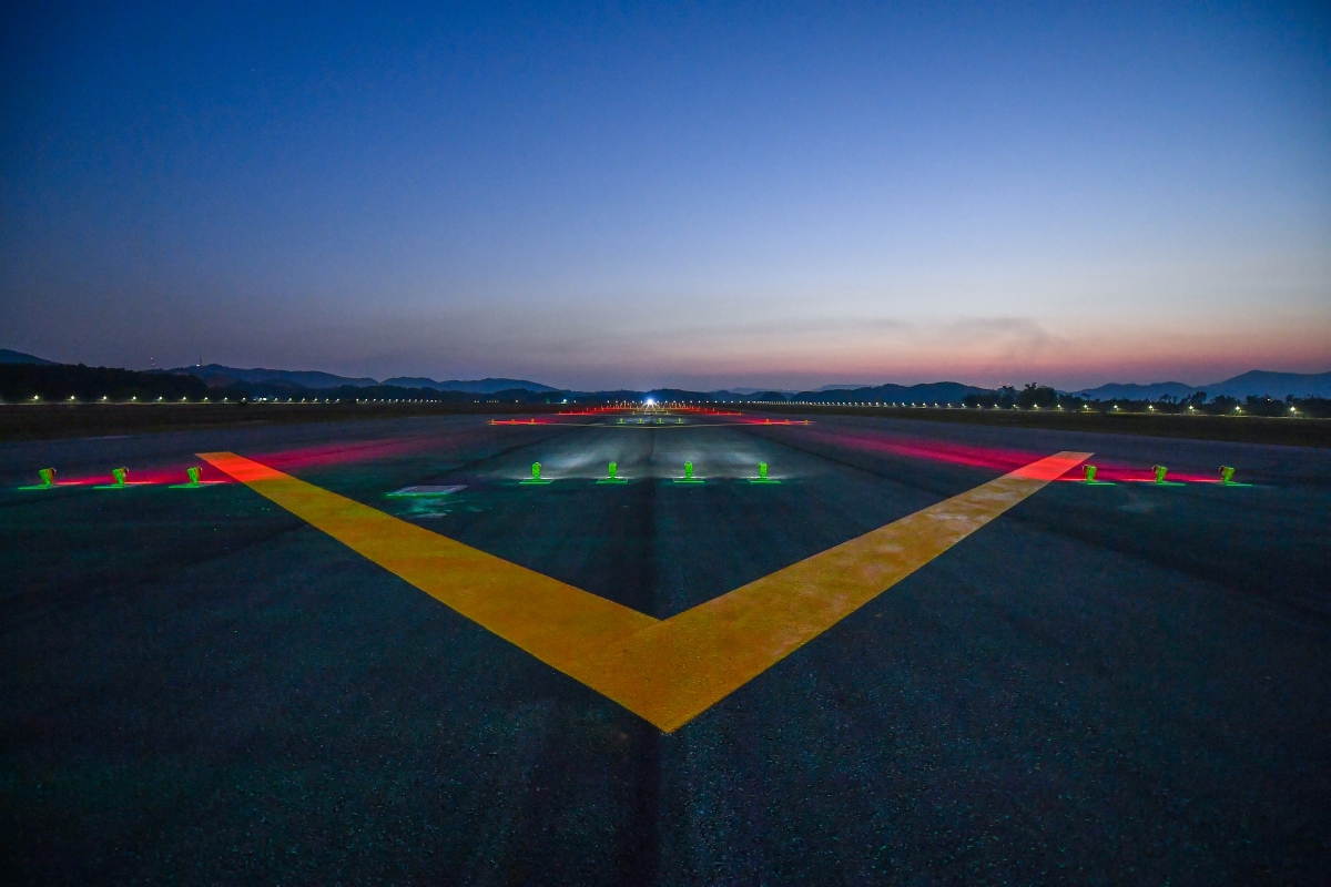 | Durch den Blick auf die Landebahn können die Passagiere das hohe Gebirge und ein Teil der Küste der Inselkreises Van Don sehen. |