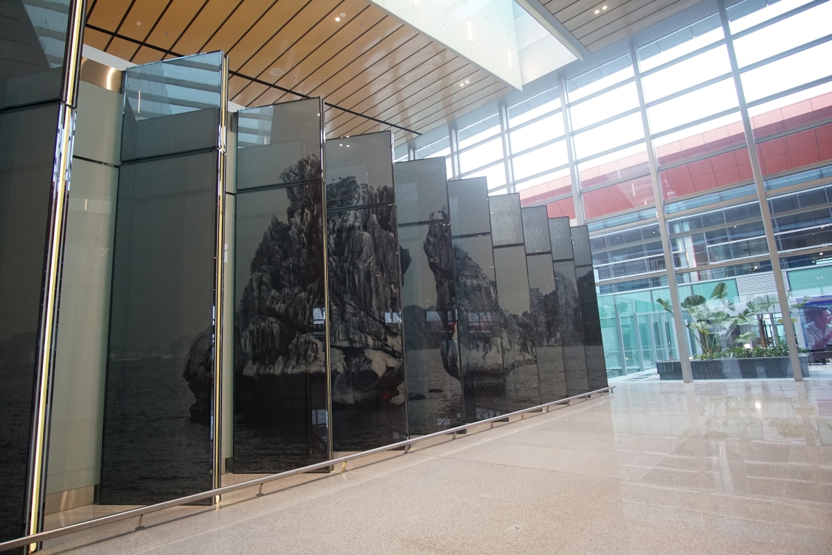 | Die Wände in der großen Halle sind mit Stein gefliest, auf denen das Bild der Ha Long-Bucht dargestellt ist. |