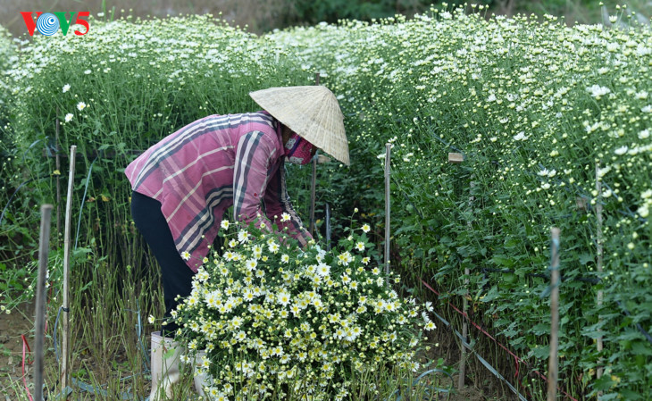 Die Echten Kamillen werden hauptsächlich in Blumengärten in Nhat Tan, Tay Tuu und am Ufer des Roten Flusses angepflanzt. Die Straßenverkäufer holen sie aus den Gärten in Nhat Tan und gehen in den Straßen in Hanoi zu verkaufen.