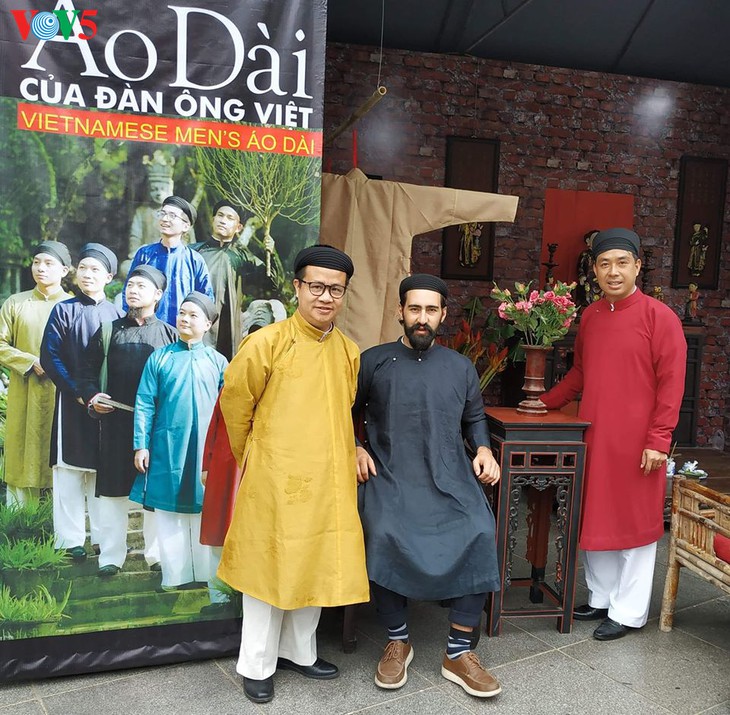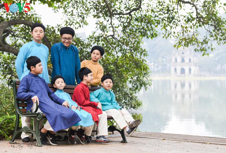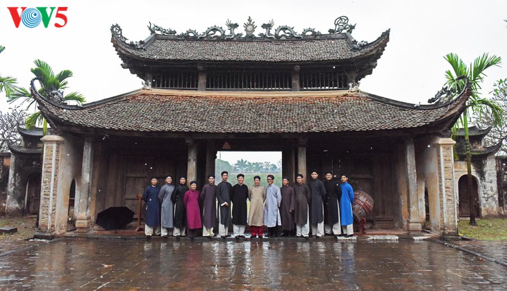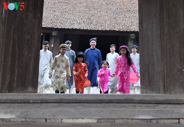 (VOVWORLD) - Bei vielen Festen, vor allem beim Neujahrsfest Tet kann man das Bild des Fünf-Streifen- Ao Dai für Männer auf Straßen, in Pagoden oder auf dem Lande sehen. Dieses Kleidungsstück ist eine Tracht und ein Stolz der Vietnamesen. In den vergangenen Jahren wird der Ao Dai überwiegend von Frauen getragen und mehrmals geehrt. Währenddessen kann man den Ao Dai für Männer hauptsächlich in Filmen und bei Kunstauftritten wie Auftritte des Cheo- und Quan Ho-Gesang sehen. Seit der Gründung des Vereins des traditionellen Ao Dais für Männer „Dinh Lang Viet“ interessieren sich immer mehr Männer für diese Tracht. Die Mitglieder dieses Vereins haben aktiv dieses nationale Markenzeichen vorgestellt und die Männer dazu ermutigt, den Ao Dai bei Festen zu tragen.
