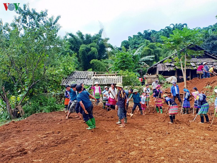 | Die Bewohner bauen gemeinsam Wohnungen im Dorf auf. |