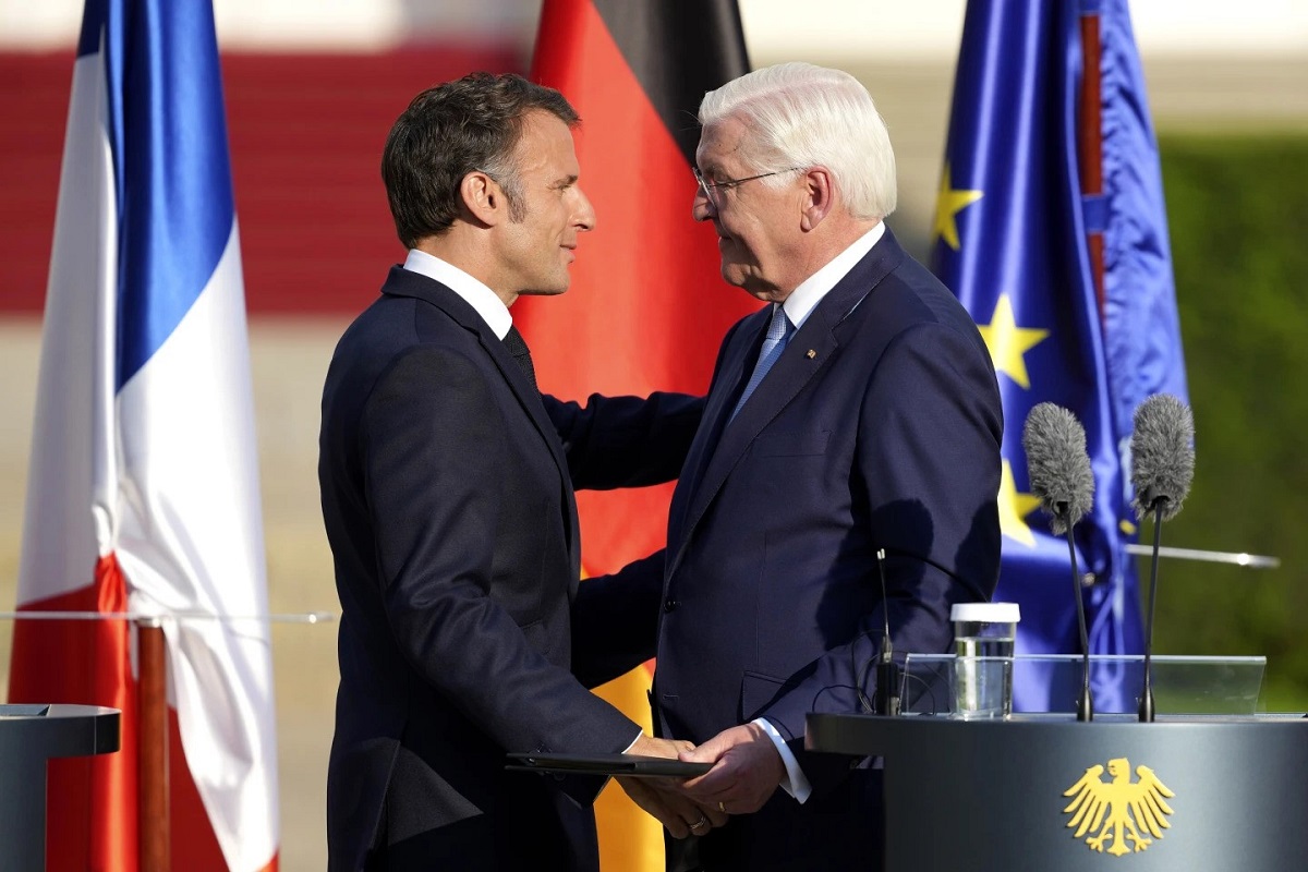 Frankreichs Präsident Emmanuel Macron (l.) und der deutsche Bundespräsident Frank-Walter Steinmeier auf einer Pressekonferenz in Berlin am 26. Mai 2024. (Foto: Markus Schreiber/AP) |