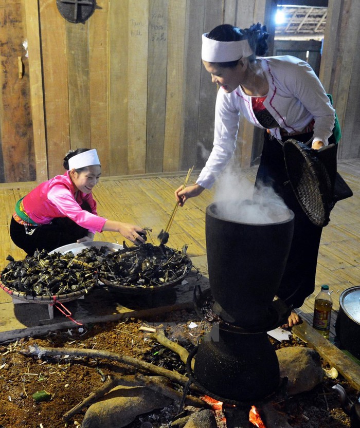 „Drei Tage vor dem Neujahrsfest werden alle Familienmitglieder die Gräber ihrer Vorfahren aufräumen und sie zum Tetfest einladen. Ein Tag vor dem Fest beginnen sie, eine Mahlzeit aus Schweinefleisch für den Ahnenkult zuzubereiten. Am Abend wickeln und kochen sie Klebreis-Kuchen. Durch die Zubereitung der Mahlzeit für den Ahnenkult erhoffen sich die Familien der Muong Vang, dass die Vorfahren jedes Mitglied der Familie mit Glück und Wohlstand segnen werden.“