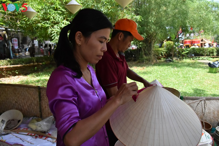 Die Produktionsstätte zur Herstellung der Strohhüte von Nguyen Thi Kiem in der Gemeinde Thuy Thanh wurde ausgewählt, um das Handwerk zur Herstellung von Strohhüten beim Festival Hue 2018 vorzustellen. Im vergangenen Jahr hatte sie schon an dem Festival in Hue teilgenommen. An den Ständen konnten die Touristen die Tüchtigkeit der Frauen bei der Produktion der Strohhüte besichtigen und sogar direkt an der Herstellung teilnehmen. Die Reiseführerin Nguyen Thi Kiem in der Gemeinde Thuy Thanh präsentiert das Handwerk ihrer Gemeinde: