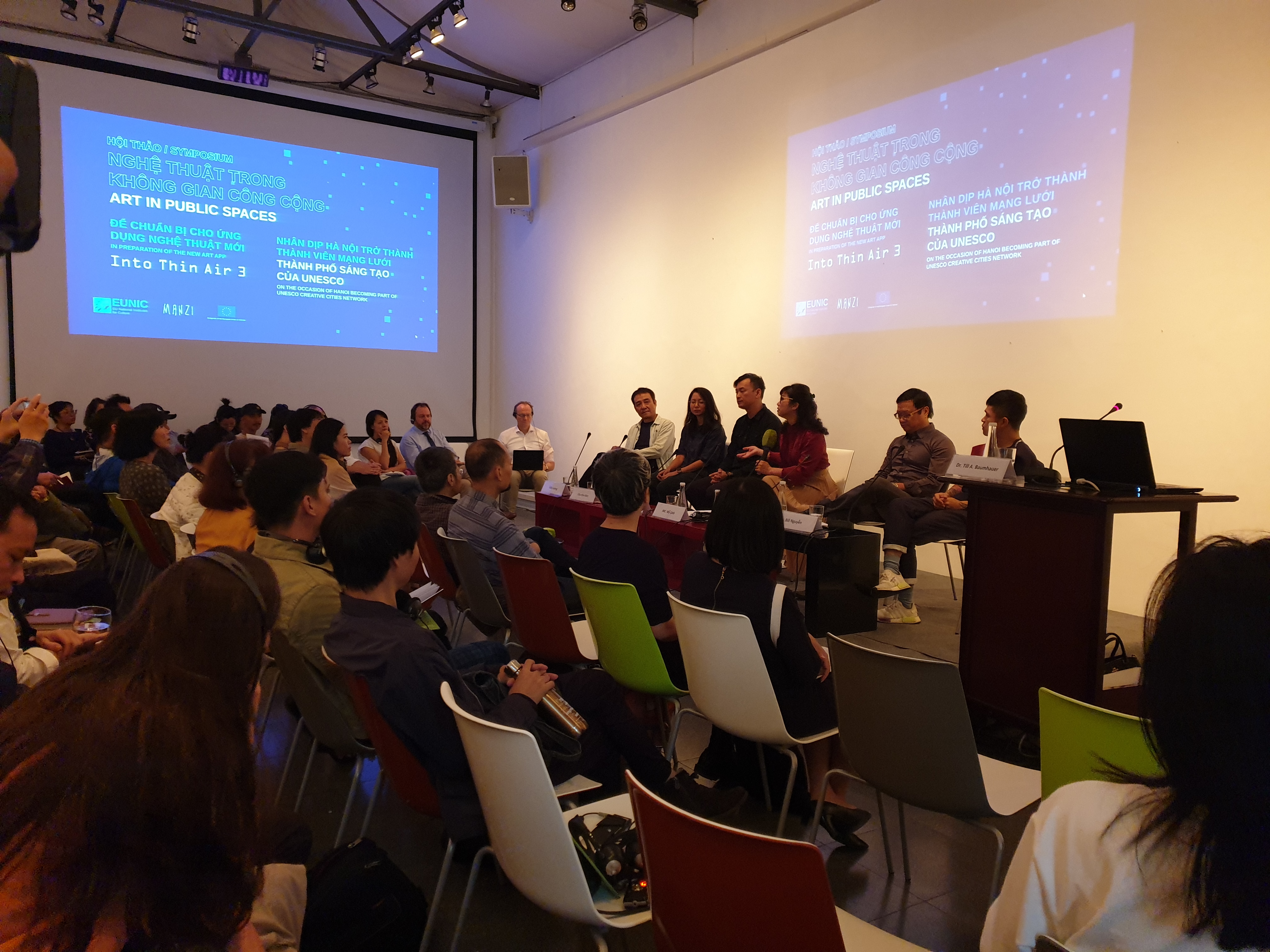 (VOVWORLD) - Vor kurzem haben die Nationalen Kulturinstitute in der Europäischen Union (EUNIC) in Vietnam in Kooperation mit Manzi Art Space das Seminar “Kunst im öffentlichen Raum” veranstaltet. Dabei diskutierten Künstler und Menschen, die sich mit der Kunst beschäftigen, sowie Vertreter der Kulturbehörde über die Rolle der Kunst im öffentlichen Raum sowie über deren Einfluss. Auch Erfahrungen bei der Zusammenarbeit mit Behörden und Organisationen bei der Umsetzung der Projekte zum Thema “Kunst im öffentlichen Raum” wurden besprochen.