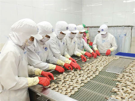 | Die Verarbeitung von Garnelen in Vietnam. |