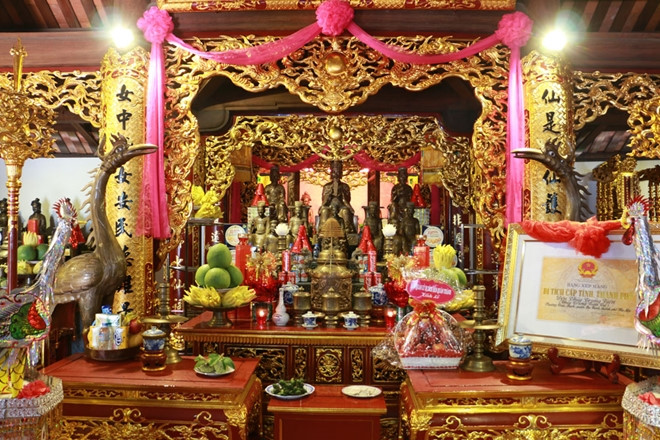 Mr. Son said that he had visited the temple a few times. Previously, he went there by boat. The temple was in the rectangular shape with a curved roof and decorated with parallel sentences. On the altar, there was a lamp, an urn, flower and incense vases, and a few small statues. Outside the temple was a bamboo blind with patterns of dragons, lakes, cloud, and water. There was also a stele featuring the name of the temple.