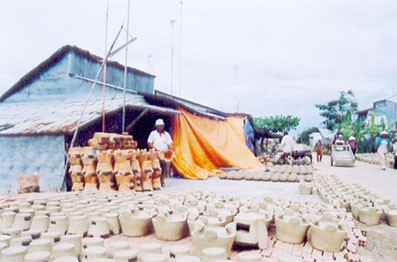 Located in the center of Hon Dat District, Dau Doi village typifies the Khmer culture and is famous for its ceramic products. The local ceramic craft flourished in the 1980s, when each household had 2 or 3 kilns. Tran Van Tue, a village resident, says he bought a machine in 2006 to make the job easier: “My family has pursued the ceramic craft for three generations. We now produce terra-cotta ovens and sell them to people in 6 southwestern provinces. Each oven costs 5,500 VND. We can make 1,000 ovens in 15 days”.