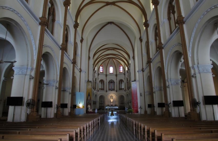 The Cathedral was designed by architect Jules Bourard, an expert in religious architecture. Based on the model of Notre Dame de Paris but smaller, it combines Romanesque and Gothic style. The building is considered the finest work in the 19th century. Thai again:"At that time, all the building materials were imported from France. The outer wall of the cathedral was built with red bricks made in Marseille. Although they are not glazed, these bricks still retain their bright red and are not overgrown with moss. "