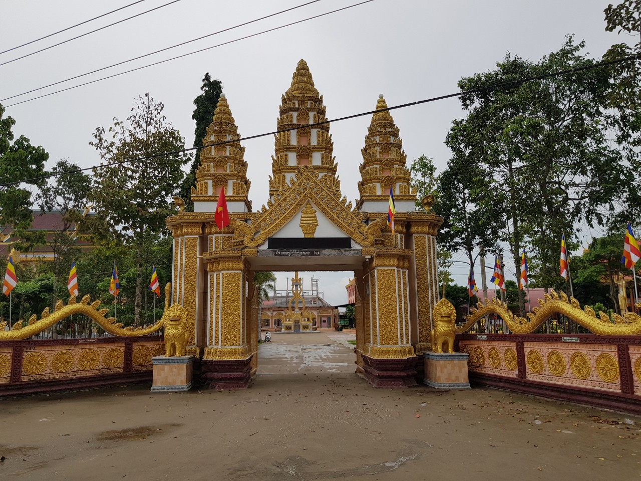 From a bird’s‑eye‑view, Ta Mon pagoda’s typical Khmer architecture and external decorations are covered in a brilliant golden color. Every pillar, door frame, roof top, in fact, every part of the pagoda is carefully carved and painted. Diverse decorative patterns combine engraving and embossing on wood and stone and also include molded cement motifs and painting.