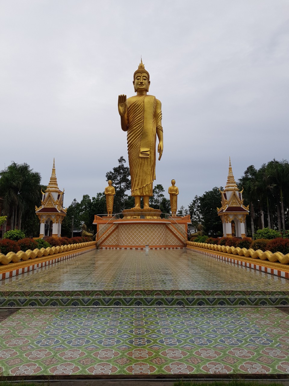 The pagoda’s huge gate has one entrance with three miniature towers on top, typical of Theravada Buddhist architecture. On both sides of the gate are intricate images of Naga snakes painted in red and gold. In the front yard there is a 20‑meter high statue of Shakyamuni Buddha.