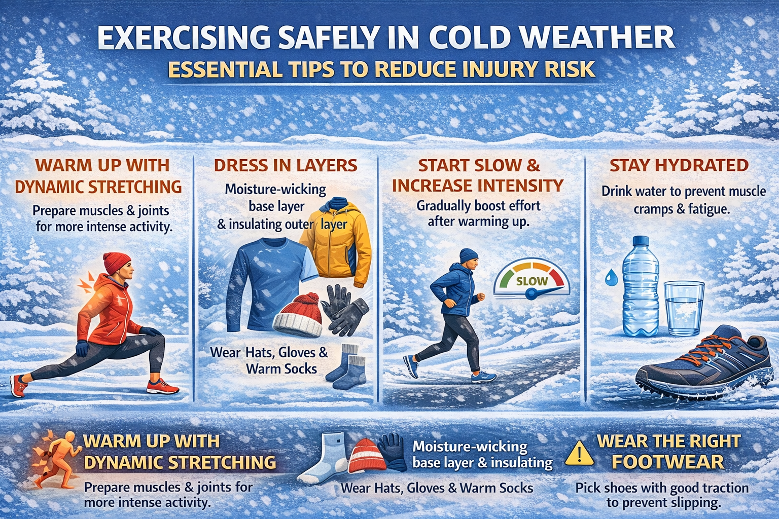Mr. Thang: In cold weather, proper warm-up routines and using the right clothing are essential for both safety and optimal performance. Cold temperatures naturally slow down circulation, leading to muscle stiffness and reduced joint range of motion. This makes it harder to perform dynamic movements and increases the risk of muscle strain, ligament injury, and even severe injuries like fractures from falls. A well-structured warm-up is crucial to prepare your body by gradually increasing heart rate, improving circulation, and raising core body temperature.