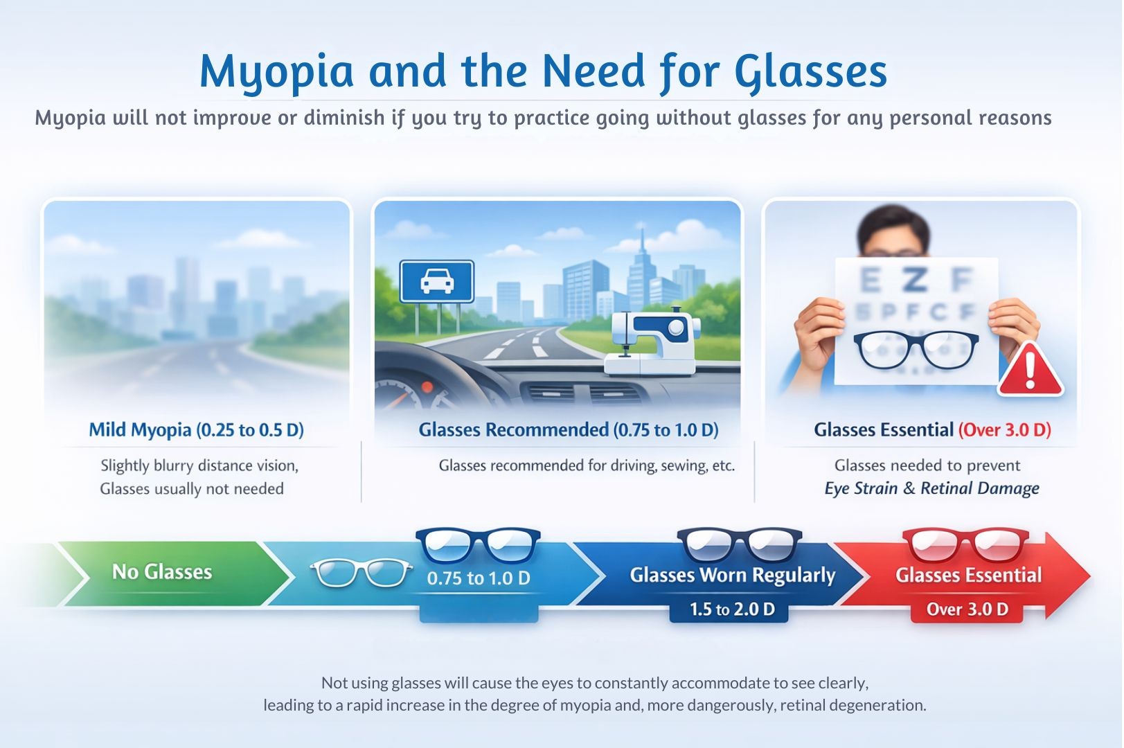 Hoang Anh: In reality, your eyes will always try to function at their best, regardless of whether you wear glasses regularly or not. Myopia will not improve or diminish if you try to practice going without glasses for any personal reasons. So, from 0.25 to 0.5 diopters, this is a minor degree of myopia. Distant vision is slightly blurry but does not significantly affect daily life.So, you may not need to wear glasses. If you have from minus 0.75 to 1 diopters, you should start wearing glasses to avoid affecting daily tasks such as driving, sewing, etc. But they do not need to be used constantly.From minus 1.5 to 2 diopters, glasses should be worn regularly to avoid affecting daily work and life. Above 3 diopters, this is a cause of moderate myopia. Not using glasses will cause the eyes to constantly accommodate to see clearly, leading to a rapid increase in the degree of myopia and, more dangerously, retinal degeneration.