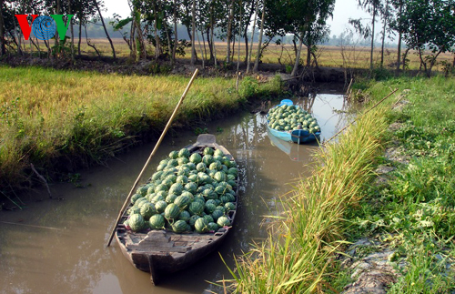| Growing watermelons in rice fields is another successful model of crop restructuring bringing in high productivity and earnings. |