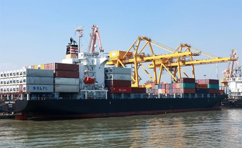 | A ship being loaded with containers at Haiphong Port (Photo: VNA) |